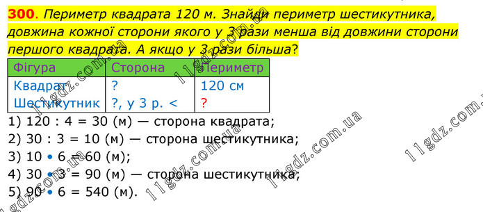 Периметр квадрата 120 м. Знайди периметр шестикутника, довжина кожної сторони якого у 3 рази менша від довжини сторони першого квадрата. А якщо у 3 рази більша? 1) 120 : 4 = 30 (м) — сторона квадрата; 2) 30 : 3 = 10 (м) — сторона шестикутника; 3) 10 • 6 = 60 (м); 4) 30 • 3 = 90 (м) — сторона шестикутника; 5) 90 • 6 = 540 (м).