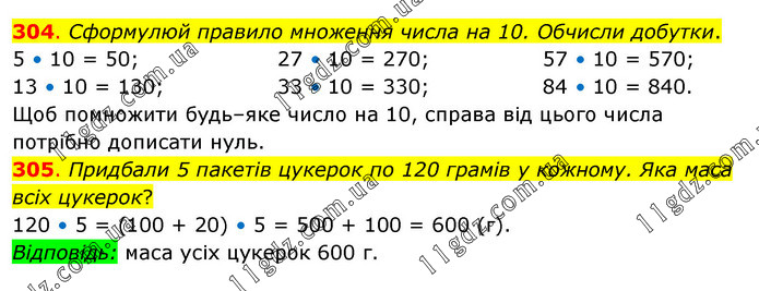 304. Сформулюй правило множення числа на 10. Обчисли добутки. 5 • 10 = 50; 13 • 10 = 130; 27 • 10 = 270; 33 • 10 = 330; 57 • 10 = 570; 84 • 10 = 840. Щоб помножити будь–яке число на 10, справа від цього числа потрібно дописати нуль. 305. Придбали 5 пакетів цукерок по 120 грамів у кожному. Яка маса всіх цукерок? 120 • 5 = (100 + 20) • 5 = 500 + 100 = 600 (г). Відповідь: маса усіх цукерок 600 г.
