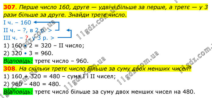 307. Перше число 160, друге — удвічі більше за перше, а третє — у 3 рази більше за друге. Знайди третє число. І ч. – 160 ІІ ч. – ?, в 2 р. > ІІІ ч. – ?, у 3 р. > 1) 160 • 2 = 320 – ІІ число; 2) 320 • 3 = 960. Відповідь: третє число – 960. 308. На скільки третє число більше за суму двох менших чисел? 1) 160 + 320 = 480 – сума І і ІІ чисел; 2) 960 – 480 = 480. Відповідь: третє число більше за суму двох менших чисел на 480.