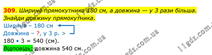Ширина прямокутника 180 см, а довжина — у 3 рази більша. Знайди довжину прямокутника. Ширина – 180 см Довжина – ?, у 3 р. > 180 • 3 = 540 (см). Відповідь: довжина 540 см.