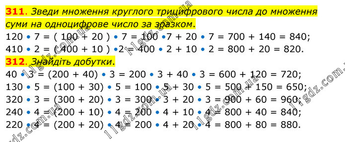 311. Зведи множення круглого трицифрового числа до множення суми на одноцифрове число за зразком. 120 • 7 = ( 100 + 20 ) • 7 = 100 •7 + 20 • 7 = 700 + 140 = 840; 410 • 2 = ( 400 + 10 ) •2 = 400 • 2 + 10 • 2 = 800 + 20 = 820. 312. Знайдіть добутки. 40 • 3 = (200 + 40) • 3 = 200 • 3 + 40 • 3 = 600 + 120 = 720; 130 • 5 = (100 + 30) • 5 = 100 • 5 + 30 • 5 = 500 + 150 = 650; 320 • 3 = (300 + 20) • 3 = 300 • 3 + 20 • 3 = 900 + 60 = 960; 240 • 4 = (200 + 10) • 4 = 200 • 4 + 10 • 4 = 800 + 40 = 840; 220 • 4 = (200 + 20) • 4 = 200 • 4 + 20 • 4 = 800 + 80 = 880.