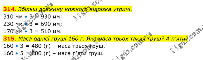 314. Збільш довжину кожного відрізка утричі. 310 мм • 3 = 930 мм; 230 мм • 3 = 690 мм; 170 мм • 3 = 510 мм. 315. Маса однієї груші 160 г. Яка маса трьох таких груш? А п'яти? 160 • 3 = 480 (г) – маса трьох груш. 160 • 5 = 800 (г) – маса п'яти груш.