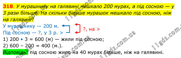 У мурашнику на галявині мешкало 200 мурах, а під сосною — у 3 рази більше. На скільки більше мурашок мешкало під сосною, ніж на галявині? У мурашнику — 200 м. Під сосною — ?, у 3 р. > 1) 200 • 3 = 600 (м) — жили під сосною; 2) 600 – 200 = 400 (м.). Відповідь: під сосною жило на 40 мурах більше, ніж на галявині.