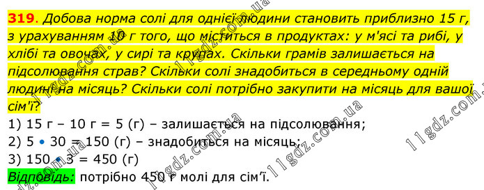 Добова норма солі для однієї людини становить приблизно 15 г, з урахуванням 10 г того, що міститься в продуктах: у м'ясі та рибі, у хлібі та овочах, у сирі та крупах. Скільки грамів залишається на підсолювання страв? Скільки солі знадобиться в середньому одній людині на місяць? Скільки солі потрібно закупити на місяць для вашої сім'ї? 1) 15 г – 10 г = 5 (г) – залишається на підсолювання; 2) 5 • 30 = 150 (г) – знадобиться на місяць; 3) 150 • 3 = 450 (г) Відповідь: потрібно 450 г молі для сім’ї.