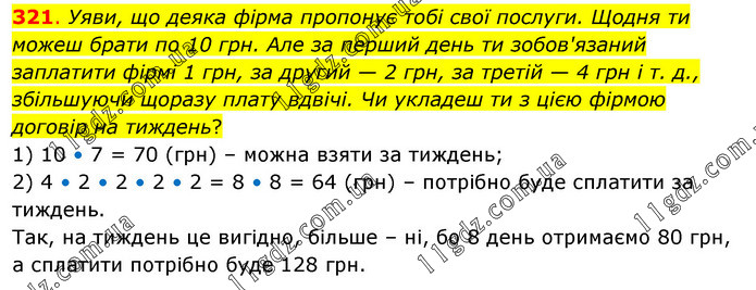 Уяви, що деяка фірма пропонує тобі свої послуги. Щодня ти можеш брати по 10 грн. Але за перший день ти зобов'язаний заплатити фірмі 1 грн, за другий — 2 грн, за третій — 4 грн і т. д., збільшуючи щоразу плату вдвічі. Чи укладеш ти з цією фірмою договір на тиждень? 1) 10 • 7 = 70 (грн) – можна взяти за тиждень; 2) 4 • 2 • 2 • 2 • 2 = 8 • 8 = 64 (грн) – потрібно буде сплатити за тиждень. Так, на тиждень це вигідно, більше – ні, бо 8 день отримаємо 80 грн, а сплатити потрібно буде 128 грн.