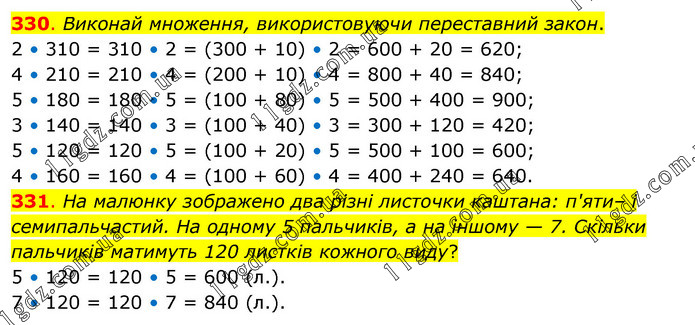 330. Виконай множення, використовуючи переставний закон. 2 • 310 = 310 • 2 = (300 + 10) • 2 = 600 + 20 = 620; 4 • 210 = 210 • 4 = (200 + 10) • 4 = 800 + 40 = 840; 5 • 180 = 180 • 5 = (100 + 80) • 5 = 500 + 400 = 900; 3 • 140 = 140 • 3 = (100 + 40) • 3 = 300 + 120 = 420; 5 • 120 = 120 • 5 = (100 + 20) • 5 = 500 + 100 = 600; 4 • 160 = 160 • 4 = (100 + 60) • 4 = 400 + 240 = 640. 331. На малюнку зображено два різні листочки каштана: п'яти– і семипальчастий. На одному 5 пальчиків, а на іншому — 7. Скільки пальчиків матимуть 120 листків кожного виду? 5 • 120 = 120 • 5 = 600 (л.). 7 • 120 = 120 • 7 = 840 (л.).