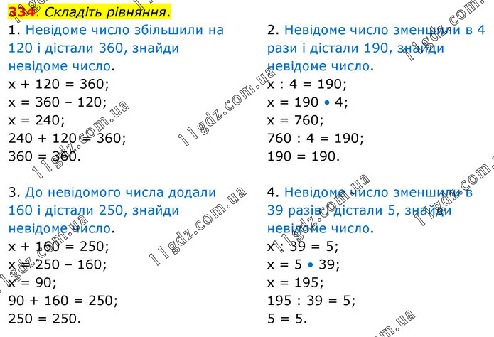 Складіть рівняння. 1. Невідоме число збільшили на 120 і дістали 360, знайди невідоме число. х + 120 = 360; х = 360 – 120; х = 240; 240 + 120 = 360; 360 = 360. 2. Невідоме число зменшили в 4 рази і дістали 190, знайди невідоме число. х : 4 = 190; х = 190 • 4; х = 760; 760 : 4 = 190; 190 = 190. 3. До невідомого числа додали 160 і дістали 250, знайди невідоме число. х + 160 = 250; х = 250 – 160; х = 90; 90 + 160 = 250; 250 = 250. 4. Невідоме число зменшили в 39 разів і дістали 5, знайди невідоме число. х : 39 = 5; х = 5 • 39; х = 195; 195 : 39 = 5; 5 = 5