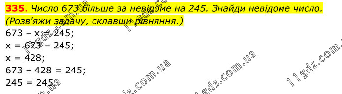 Число 673 більше за невідоме на 245. Знайди невідоме число. (Розв'яжи задачу, склавши рівняння.) 673 – х = 245; х = 673 – 245; х = 428; 673 – 428 = 245; 245 = 245.
