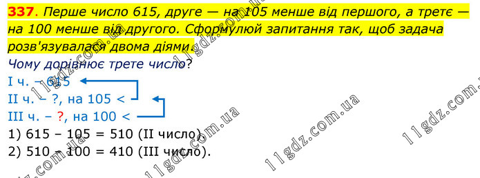Перше число 615, друге — на 105 менше від першого, а третє — на 100 менше від другого. Сформулюй запитання так, щоб задача розв'язувалася двома діями. Чому дорівнює трете число? І ч. – 615 ІІ ч. – ?, на 105 < ІІІ ч. – ?, на 100 < 1) 615 – 105 = 510 (ІІ число). 2) 510 – 100 = 410 (ІІІ число).