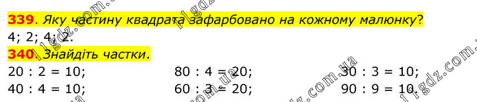 339. Яку частину квадрата зафарбовано на кожному малюнку? 4; 2; 4; 2. 340. Знайдіть частки. 20 : 2 = 10; 40 : 4 = 10; 80 : 4 = 20; 60 : 3 = 20; 30 : 3 = 10; 90 : 9 = 10.