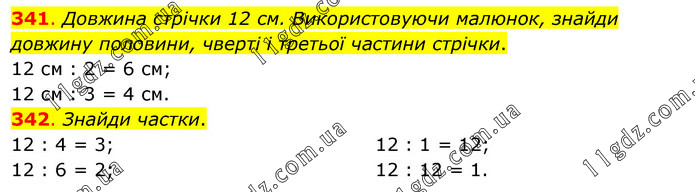 341. Довжина стрічки 12 см. Використовуючи малюнок, знайди довжину половини, чверті і третьої частини стрічки. 12 см : 2 = 6 см; 12 см : 3 = 4 см. 342. Знайди частки. 12 : 4 = 3; 12 : 6 = 2; 12 : 1 = 12; 12 : 12 = 1.