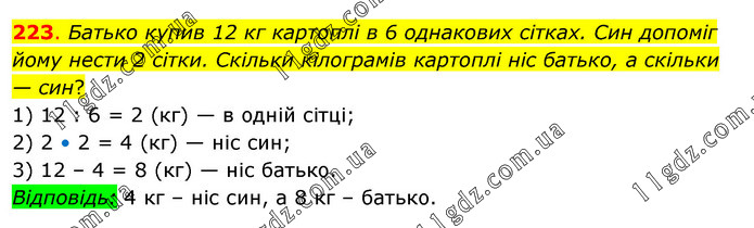 Батько купив 12 кг картоплі в 6 однакових сітках. Син допоміг йому нести 2 сітки. Скільки кілограмів картоплі ніс батько, а скільки — син? 1) 12 : 6 = 2 (кг) — в одній сітці; 2) 2 • 2 = 4 (кг) — ніс син; 3) 12 – 4 = 8 (кг) — ніс батько. Відповідь: 4 кг – ніс син, а 8 кг – батько.
