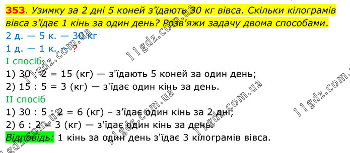 Узимку за 2 дні 5 коней з'їдають 30 кг вівса. Скільки кілограмів вівса з'їдає 1 кінь за один день? Розв'яжи задачу двома способами. 2 д. — 5 к. — 30 кг 1 д. — 1 к. — ? І спосіб 1) 30 : 2 = 15 (кг) — з'їдають 5 коней за один день; 2) 15 : 5 = 3 (кг) — з'їдає один кінь за день. ІІ спосіб 1) 30 : 5 : 2 = 6 (кг) – з’їдає один кінь за 2 дні; 2) 6 : 2 = 3 (кг) — з'їдає один кінь за день. Відповідь: 1 кінь за один день з'їдає 3 кілограмів вівса.