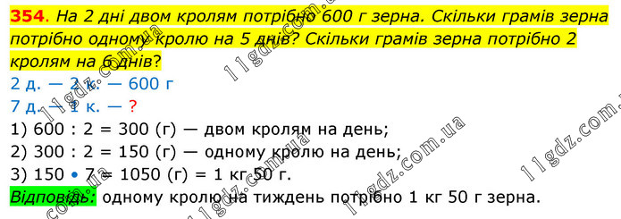 На 2 дні двом кролям потрібно 600 г зерна. Скільки грамів зерна потрібно одному кролю на 5 днів? Скільки грамів зерна потрібно 2 кролям на 6 днів? 2 д. — 2 к. — 600 г 7 д. — 1 к. — ? 1) 600 : 2 = 300 (г) — двом кролям на день; 2) 300 : 2 = 150 (г) — одному кролю на день; 3) 150 • 7 = 1050 (г) = 1 кг 50 г. Відповідь: одному кролю на тиждень потрібно 1 кг 50 г зерна.