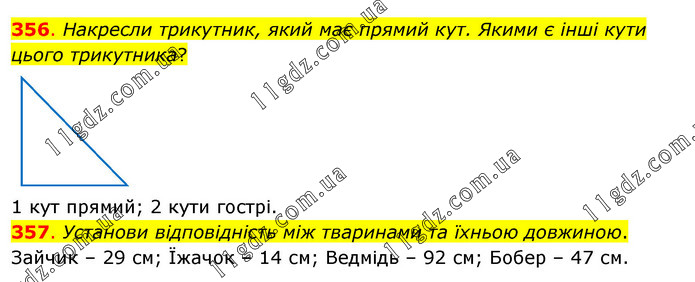 356. Накресли трикутник, який має прямий кут. Якими є інші кути цього трикутника? 1 кут прямий; 2 кути гострі. 357. Установи відповідність між тваринами та їхньою довжиною. Зайчик – 29 см; Їжачок – 14 см; Ведмідь – 92 см; Бобер – 47 см.