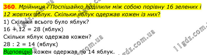 Мрійниця і Поспішайко поділили між собою порівну 16 зелених і 12 жовтих яблук. Скільки яблук одержав кожен із них? 1) Скільки всього було яблук? 16 + 12 = 28 (яблук) Скільки яблук одержав кожен? 28 : 2 = 14 (яблук) Відповідь: кожен одержав по 14 яблук.