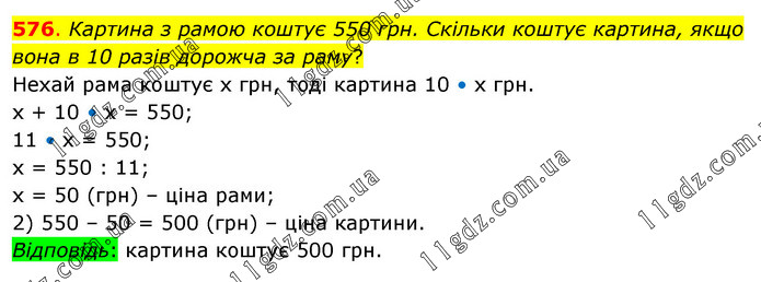 Картина з рамою коштує 550 грн. Скільки коштує картина, якщо вона в 10 разів дорожча за раму? Нехай рама коштує х грн, тоді картина 10 • х грн. х + 10 • х = 550; 11 • х = 550; х = 550 : 11; х = 50 (грн) – ціна рами; 2) 550 – 50 = 500 (грн) – ціна картини. Відповідь: картина коштує 500 грн.