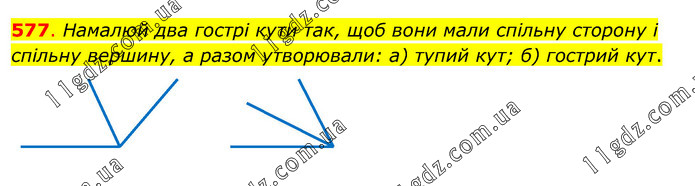 Намалюй два гострі кути так, щоб вони мали спільну сторону і спільну вершину, а разом утворювали: а) тупий кут; б) гострий кут.