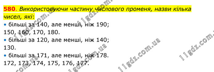 Використовуючи частину числового променя, назви кілька чисел, які: • більші за 140, але менші, ніж 190; 150, 160, 170, 180. • більші за 120, але менші, ніж 140; 130. • більші за 171, але менші, ніж 178. 172, 173, 174, 175, 176, 177.