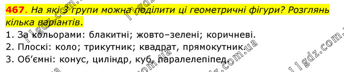 На які 3 групи можна поділити ці геометричні фігури? Розглянь кілька варіантів. 1. За кольорами: блакитні; жовто–зелені; коричневі. 2. Плоскі: коло; трикутник; квадрат, прямокутник. 3. Об’ємні: конус, циліндр, куб, паралелепіпед.
