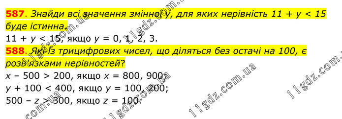 587. Знайди всі значення змінної у, для яких нерівність 11 + у < 15 буде істинна. 11 + у < 15, якщо у = 0, 1, 2, 3. 588. Які із трицифрових чисел, що діляться без остачі на 100, є розв'язками нерівностей? х – 500 > 200, якщо х = 800, 900; у + 100 < 400, якщо у = 100, 200; 500 – z > 300, якщо z = 100.
