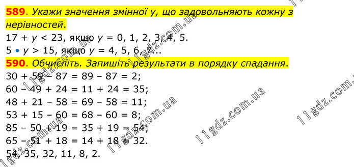 589. Укажи значення змінної у, що задовольняють кожну з нерівностей. 17 + у < 23, якщо у = 0, 1, 2, 3, 4, 5. 5 • у > 15, якщо у = 4, 5, 6, 7... 590. Обчисліть. Запишіть результати в порядку спадання. 30 + 59 – 87 = 89 – 87 = 2; 60 – 49 + 24 = 11 + 24 = 35; 48 + 21 – 58 = 69 – 58 = 11; 53 + 15 – 60 = 68 – 60 = 8; 85 – 50 + 19 = 35 + 19 = 54; 65 – 51 + 18 = 14 + 18 = 32. 54, 35, 32, 11, 8, 2.