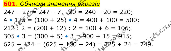 Обчисли значення виразів 247 – 27 = 247 – 7 – 20 = 240 – 20 = 220; 4 • 125 = (100 + 25) • 4 = 400 + 100 = 500; 212 : 2 = (200 + 12) : 2 = 100 + 6 = 106; 305 • 3 = (300 + 5) • 3 = 900 + 15 = 915; 625 + 124 = (625 + 100 + 24) = 725 + 24 = 749.