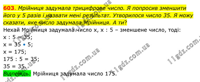 Мрійниця задумала трицифрове число. Я попросив зменшити його у 5 разів і назвати мені результат. Утворилося число 35. Я можу сказати, яке число задумала Мрійниця. А ти? Нехай Мрійниця задумала число х, х : 5 – зменшене число, тоді: х : 5 = 35; х = 35 • 5; х = 175; 175 : 5 = 35; 35 = 35. Відповідь: Мрійниця задумала число 175.