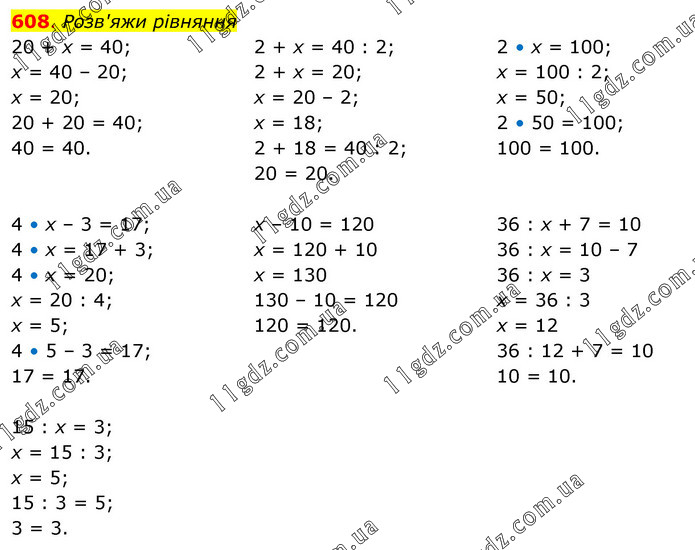 Розв'яжи рівняння 20 + х = 40; х = 40 – 20; х = 20; 20 + 20 = 40; 40 = 40. 2 + х = 40 : 2; 2 + х = 20; х = 20 – 2; х = 18; 2 + 18 = 40 : 2; 20 = 20. 2 • х = 100; х = 100 : 2; х = 50; 2 • 50 = 100; 100 = 100. 4 • х – 3 = 17; 4 • х = 17 + 3; 4 • х = 20; х = 20 : 4; х = 5; 4 • 5 – 3 = 17; 17 = 17. х – 10 = 120 х = 120 + 10 х = 130 130 – 10 = 120 120 = 120. 36 : х + 7 = 10 36 : х = 10 – 7 36 : х = 3 х = 36 : 3 х = 12 36 : 12 + 7 = 10 10 = 10. 15 : x = 3; х = 15 : 3; х = 5; 15 : 3 = 5; 3 = 3.