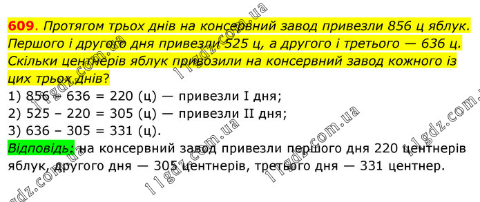 Протягом трьох днів на консервний завод привезли 856 ц яблук. Першого і другого дня привезли 525 ц, а другого і третього — 636 ц. Скільки центнерів яблук привозили на консервний завод кожного із цих трьох днів? 1) 856 – 636 = 220 (ц) — привезли І дня; 2) 525 – 220 = 305 (ц) — привезли ІІ дня; 3) 636 – 305 = 331 (ц). Відповідь: на консервний завод привезли першого дня 220 центнерів яблук, другого дня — 305 центнерів, третього дня — 331 центнер.