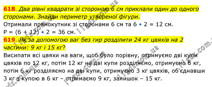 618. Два рівні квадрати зі стороною 6 см приклали один до одного сторонами. Знайди периметр утвореної фігури. Отримали прямокутник зі сторонами 6 см та 6 • 2 = 12 см. Р = (6 + 12) • 2 = 36 см. 619. Як за допомогою ваг без гир розділити 24 кг цвяхів на 2 частини: 9 кг і 15 кг? Висипати всі цвяхи на ваги, щоб було порівну, отримуємо дві купи цвяхів по 12 кг, потім 12 кг на дві купи розділяємо, отримуємо 6 кг, потім 6 кг розділяємо на дві купи, отримуємо 3 кг цвяхів, об'єднавши 3 кг з купою в 6 кг – отримаємо 9 кг, залишок – 15 кг.