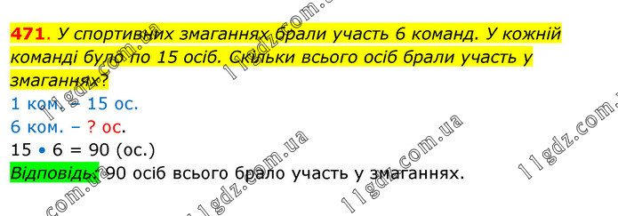 У спортивних змаганнях брали участь 6 команд. У кожній команді було по 15 осіб. Скільки всього осіб брали участь у змаганнях? 1 ком. – 15 ос. 6 ком. – ? ос. 15 • 6 = 90 (ос.) Відповідь: 90 осіб всього брало участь у змаганнях.