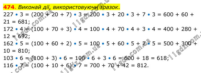 Виконай дії, використовуючи зразок. 227 • 3 = (200 + 20 + 7) • 3 = 200 • 3 + 20 • 3 + 7 • 3 = 600 + 60 + 21 = 681; 172 • 4 = (100 + 70 + 3) • 4 = 100 • 4 + 70 • 4 + 3 • 4 = 400 + 280 + 12 = 692; 162 • 5 = (100 + 60 + 2) • 5 = 100 • 5 + 60 • 5 + 2 • 5 = 500 + 300 + 10 = 810; 103 • 6 = (100 + 3) • 6 = 100 • 6 + 3 • 6 = 600 + 18 = 618; 116 • 7 = (100 + 10 + 6) • 7 = 700 + 70 + 42 = 812.