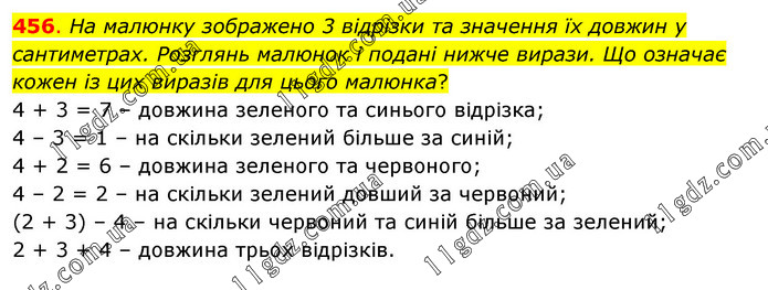 На малюнку зображено 3 відрізки та значення їх довжин у сантиметрах. Розглянь малюнок і подані нижче вирази. Що означає кожен із цих виразів для цього малюнка? 4 + 3 = 7 – довжина зеленого та синього відрізка; 4 – 3 = 1 – на скільки зелений більше за синій; 4 + 2 = 6 – довжина зеленого та червоного; 4 – 2 = 2 – на скільки зелений довший за червоний; (2 + 3) – 4 – на скільки червоний та синій більше за зелений; 2 + 3 + 4 – довжина трьох відрізків.