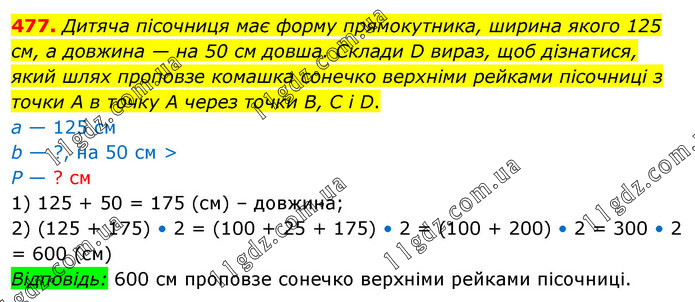 Дитяча пісочниця має форму прямокутника, ширина якого 125 см, а довжина — на 50 см довша. Склади D вираз, щоб дізнатися, який шлях проповзе комашка сонечко верхніми рейками пісочниці з точки А в точку А через точки В, С і D. а — 125 см b — ?, на 50 см > Р — ? см 1) 125 + 50 = 175 (см) – довжина; 2) (125 + 175) • 2 = (100 + 25 + 175) • 2 = (100 + 200) • 2 = 300 • 2 = 600 (см) Відповідь: 600 см проповзе сонечко верхніми рейками пісочниці.