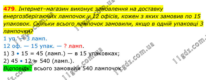 Інтернет–магазин виконує замовлення на доставку енергозберігаючих лампочок у 12 офісів, кожен з яких замовив по 15 упаковок. Скільки всього лампочок замовили, якщо в одній упаковці 3 лампочки? 1 уп. — 3 ламп. 12 оф. — 15 упак. — ? ламп. 1) 3 • 15 = 45 (ламп.) — в 15 упаковках; 2) 45 • 12 = 540 (ламп.). Відповідь: всього замовили 540 лампочок.