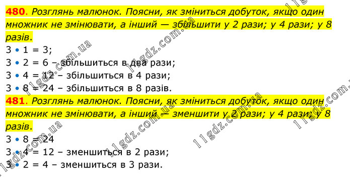 480. Розглянь малюнок. Поясни, як зміниться добуток, якщо один множник не змінювати, а інший — збільшити у 2 рази; у 4 рази; у 8 разів. 3 • 1 = 3; 3 • 2 = 6 – збільшиться в два рази; 3 • 4 = 12 – збільшиться в 4 рази; 3 • 8 = 24 – збільшиться в 8 разів. 481. Розглянь малюнок. Поясни, як зміниться добуток, якщо один множник не змінювати, а інший — зменшити у 2 рази; у 4 рази; у 8 разів. 3 • 8 = 24 3 • 4 = 12 – зменшиться в 2 рази; 3 • 2 = 4 – зменшиться в 3 рази.