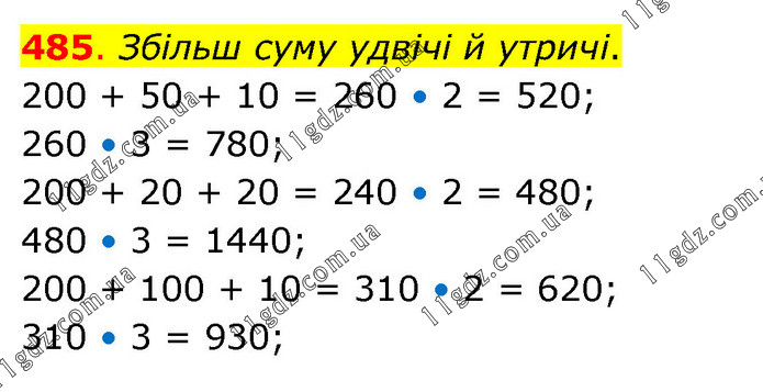 Збільш суму удвічі й утричі. 200 + 50 + 10 = 260 • 2 = 520; 260 • 3 = 780; 200 + 20 + 20 = 240 • 2 = 480; 480 • 3 = 1440; 200 + 100 + 10 = 310 • 2 = 620; 310 • 3 = 930;