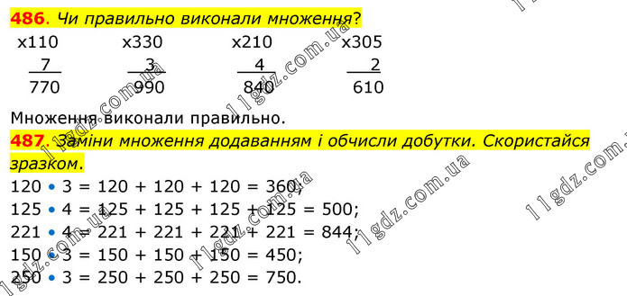 487. Заміни множення додаванням і обчисли добутки. Скористайся зразком. 120 • 3 = 120 + 120 + 120 = 360; 125 • 4 = 125 + 125 + 125 + 125 = 500; 221 • 4 = 221 + 221 + 221 + 221 = 844; 150 • 3 = 150 + 150 + 150 = 450; 250 • 3 = 250 + 250 + 250 = 750.