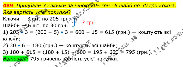 Придбали 3 ключки за ціною 205 грн і 6 шайб по 30 грн кожна. Яка вартість усієї покупки? Ключи — 3 шт. по 205 грн. Шайби — 6 шт. по 30 грн. 1) 205 • 3 = (200 + 5) • 3 = 600 + 15 = 615 (грн.) — коштують всі ключи; 2) 30 • 6 = 180 (грн.) — коштують всі шайби; 3) 180 + 615 = (180 + 15) + 600 = 195 + 600 = 795 (грн.). Відповідь: 795 гривень вартість усієї покупки.