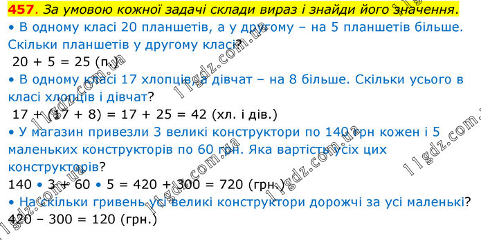 За умовою кожної задачі склади вираз і знайди його значення. • В одному класі 20 планшетів, а у другому – на 5 планшетів більше. Скільки планшетів у другому класі? 20 + 5 = 25 (п.) • В одному класі 17 хлопців, а дівчат – на 8 більше. Скільки усього в класі хлопців і дівчат? 17 + (17 + 8) = 17 + 25 = 42 (хл. і дів.) • У магазин привезли 3 великі конструктори по 140 грн кожен і 5 маленьких конструкторів по 60 грн. Яка вартість усіх цих конструкторів? 140 • 3 + 60 • 5 = 420 + 300 = 720 (грн.) • На скільки гривень усі великі конструктори дорожчі за усі маленькі? 420 – 300 = 120 (грн.)