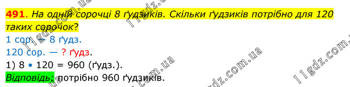 На одній сорочці 8 ґудзиків. Скільки ґудзиків потрібно для 120 таких сорочок? 1 сор. — 8 ґудз. 120 сор. — ? ґудз. 1) 8 • 120 = 960 (ґудз.). Відповідь: потрібно 960 ґудзиків.