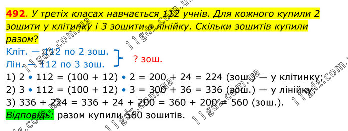 У третіх класах навчається 112 учнів. Для кожного купили 2 зошити у клітинку і 3 зошити в лінійку. Скільки зошитів купили разом? Кліт. — 112 по 2 зош. Лін. — 112 по 3 зош. 1) 2 • 112 = (100 + 12) • 2 = 200 + 24 = 224 (зош.) — у клітинку; 2) 3 • 112 = (100 + 12) • 3 = 300 + 36 = 336 (зош.) — у лінійку; 3) 336 + 224 = 336 + 24 + 200 = 360 + 200 = 560 (зош.). Відповідь: разом купили 560 зошитів.
