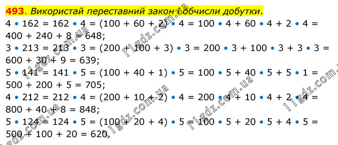 Використай переставний закон і обчисли добутки. 4 • 162 = 162 • 4 = (100 + 60 + 2) • 4 = 100 • 4 + 60 • 4 + 2 • 4 = 400 + 240 + 8 = 648; 3 • 213 = 213 • 3 = (200 + 100 + 3) • 3 = 200 • 3 + 100 • 3 + 3 • 3 = 600 + 30 + 9 = 639; 5 • 141 = 141 • 5 = (100 + 40 + 1) • 5 = 100 • 5 + 40 • 5 + 5 • 1 = 500 + 200 + 5 = 705; 4 • 212 = 212 • 4 = (200 + 10 + 2) • 4 = 200 • 4 + 10 • 4 + 2 • 4 = 800 + 40 + 8 = 848; 5 • 124 = 124 • 5 = (100 + 20 + 4) • 5 = 100 • 5 + 20 • 5 + 4 • 5 = 500 + 100 + 20 = 620.