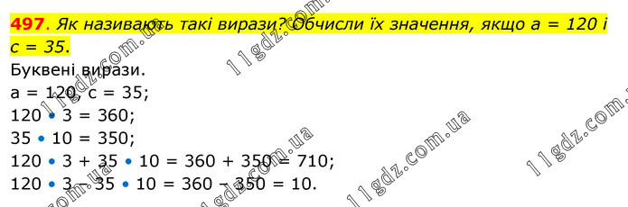 Як називають такі вирази? Обчисли їх значення, якщо а = 120 і с = 35. Буквені вирази. а = 120, с = 35; 120 • 3 = 360; 35 • 10 = 350; 120 • 3 + 35 • 10 = 360 + 350 = 710; 120 • 3 – 35 • 10 = 360 – 350 = 10.
