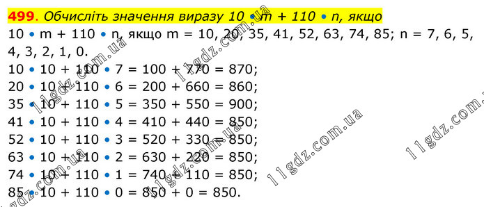 Обчисліть значення виразу 10 • m + 110 • n, якщо 10 • m + 110 • n, якщо m = 10, 20, 35, 41, 52, 63, 74, 85; n = 7, 6, 5, 4, 3, 2, 1, 0. 10 • 10 + 110 • 7 = 100 + 770 = 870; 20 • 10 + 110 • 6 = 200 + 660 = 860; 35 • 10 + 110 • 5 = 350 + 550 = 900; 41 • 10 + 110 • 4 = 410 + 440 = 850; 52 • 10 + 110 • 3 = 520 + 330 = 850; 63 • 10 + 110 • 2 = 630 + 220 = 850; 74 • 10 + 110 • 1 = 740 + 110 = 850; 85 • 10 + 110 • 0 = 850 + 0 = 850.