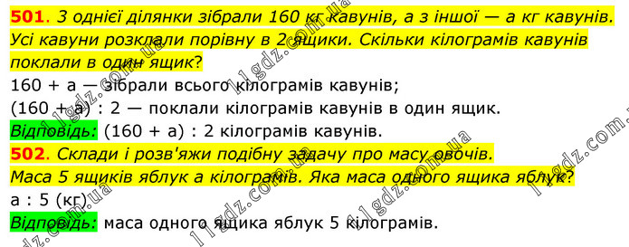 501. 3 однієї ділянки зібрали 160 кг кавунів, а з іншої — а кг кавунів. Усі кавуни розклали порівну в 2 ящики. Скільки кілограмів кавунів поклали в один ящик? 160 + а — зібрали всього кілограмів кавунів; (160 + а) : 2 — поклали кілограмів кавунів в один ящик. Відповідь: (160 + а) : 2 кілограмів кавунів. 502. Склади і розв'яжи подібну задачу про масу овочів. Маса 5 ящиків яблук а кілограмів. Яка маса одного ящика яблук? а : 5 (кг) Відповідь: маса одного ящика яблук 5 кілограмів.