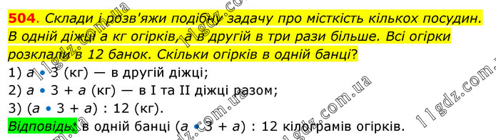 Склади і розв'яжи подібну задачу про місткість кількох посудин. В одній діжці а кг огірків, а в другій в три рази більше. Всі огірки розклали в 12 банок. Скільки огірків в одній банці? 1) а • 3 (кг) — в другій діжці; 2) а • 3 + а (кг) — в І та ІІ діжці разом; 3) (а • 3 + а) : 12 (кг). Відповідь: в одній банці (а • 3 + а) : 12 кілограмів огірків.