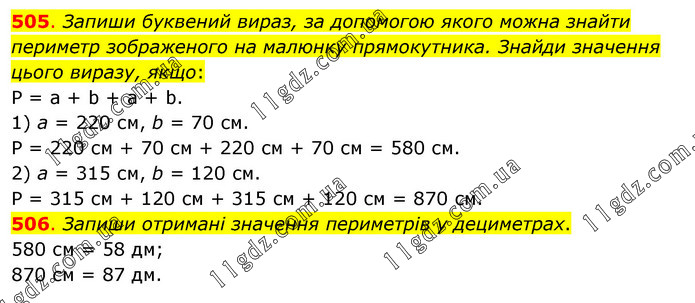 505. Запиши буквений вираз, за допомогою якого можна знайти периметр зображеного на малюнку прямокутника. Знайди значення цього виразу, якщо: Р = а + b + а + b. 1) а = 220 см, b = 70 см. Р = 220 см + 70 см + 220 см + 70 см = 580 см. 2) а = 315 см, b = 120 см. Р = 315 см + 120 см + 315 см + 120 см = 870 см. 506. Запиши отримані значення периметрів у дециметрах. 580 см = 58 дм; 870 см = 87 дм.