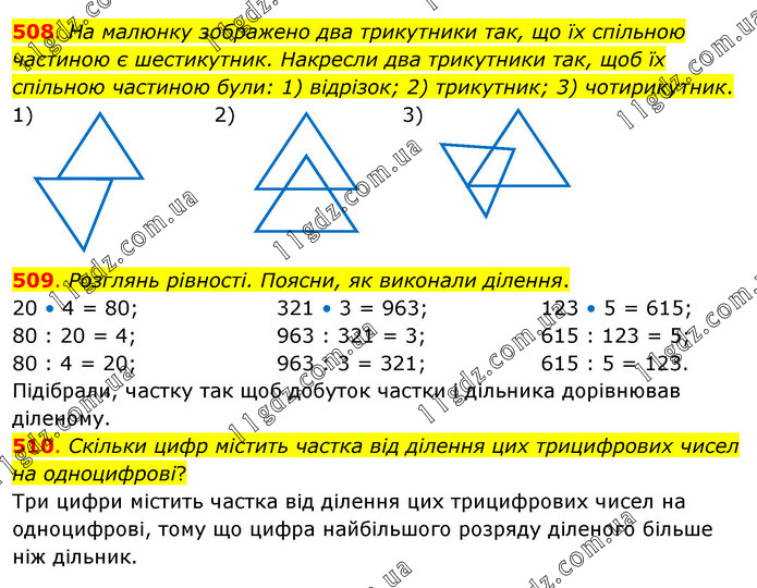 На малюнку зображено два трикутники так, що їх спільною частиною є шестикутник. Накресли два трикутники так, щоб їх спільною частиною були: 1) відрізок; 2) трикутник; 3) чотирикутник. 509. Розглянь рівності. Поясни, як виконали ділення. 20 • 4 = 80; 80 : 20 = 4; 80 : 4 = 20; 321 • 3 = 963; 963 : 321 = 3; 963 : 3 = 321; 123 • 5 = 615; 615 : 123 = 5; 615 : 5 = 123. Підібрали, частку так щоб добуток частки і дільника дорівнював діленому. 510. Скільки цифр містить частка від ділення цих трицифрових чисел на одноцифрові? Три цифри містить частка від ділення цих трицифрових чисел на одноцифрові, тому що цифра найбільшого розряду діленого більше ніж дільник.